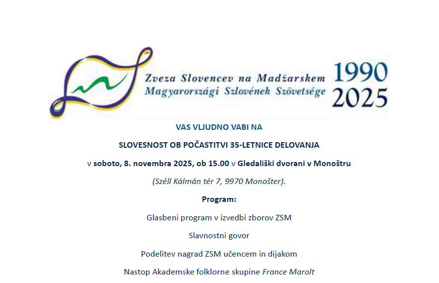 A Magyarországi Szlovének Szövetsége fennállásának 35. évfordulója alkalmából rendezett ünnepségen fellép a France Marolt Akadémiai Néptáncegyüttes. Mindenkit szeretettel várunk!